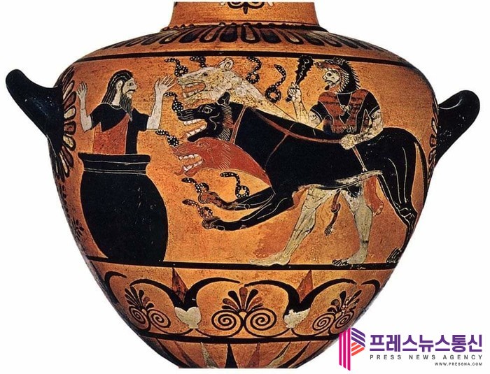 ▲ 위 사진은 열두번째 과업을 위해 케르베로스를 힘으로 제압해 이승으로 데려오자 공포에 질린 에우리스테우스 왕이 청동항아리에 숨는 장면을 묘사한 항아리다. 오른쪽에 고삐를 쥔 이가 헤라클레스다. 케르베로스는 누가 통제하는가에 따라 충직한 파수꾼이 될 수도, 공포의 대상이 될 수도 있음이다. |