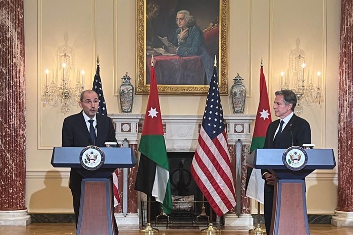 ▲ 16일(현지시간) 요르단 아이만 사파디 외무장관(왼쪽)과 앤서니 블링컨 미 국무장관이 기자회견을 하고 있다. (사진=요르단 외무부 제공) |