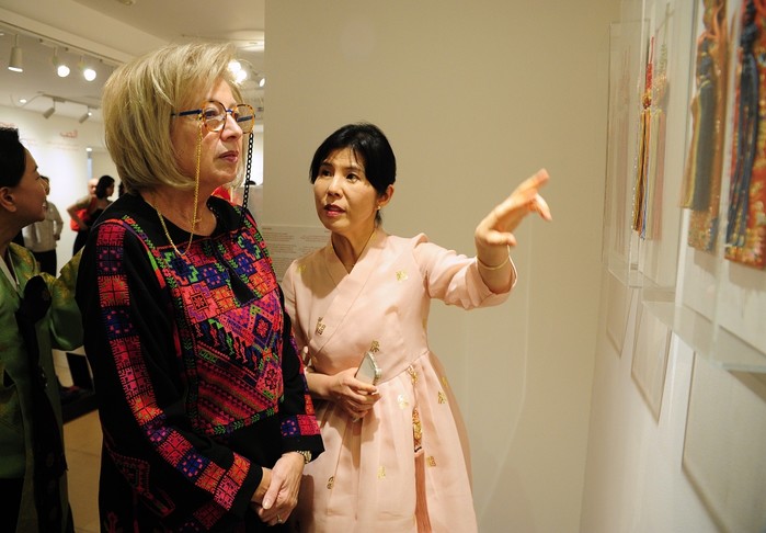 | 안세은 작가 겸 큐레이터가 하이파 알 나자르 요르단 문화부 장관에게 전시 작품을 설명하고 있다. |