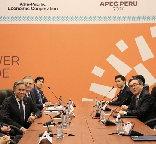 | ▲조태열 외교부 장관(오른쪽 맨앞)과 토니 블링컨 미 국무장관이 14일(현지시각) 아시아태평양경제협력체(APEC) 각료회의가 열리고 있는 페루 리마에서 한·미 외교장관 회담을 하고 있다.(사진= 외교부) |