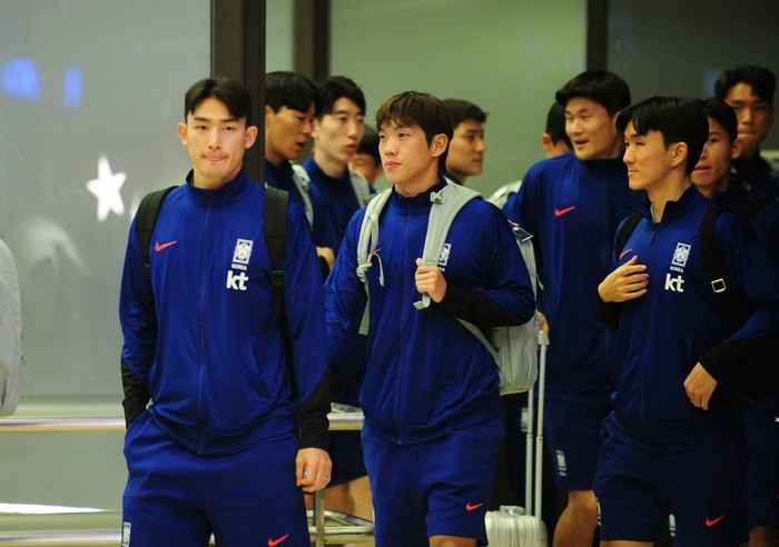 [프레스뉴스] 채정병 특파원=2026 북중미월드컵 아시아 3차 예선 B조 팔레스타인과의 6차전(19일)을 위해 대한민국 축구대표팀이 17일(현지시간) 쿠웨이트발 전세기로 경기가 열릴 요르단 암만에 도착한 가운데 선수들이 공항 입국장을 빠져 나오고 있다.