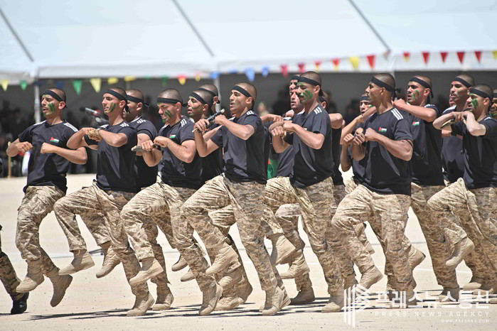 [프레스뉴스] 채정병 특파원=29일(현지시간) 요르단 자르카 국가 군복무 훈련센터에서 열린 제1기 군사훈련수료식에서 특공무술팀이 연병장을 뛰고 있다. 지역 정세불안에 따른 안보강화 등의 목적으로 작년에 법이 통과된 후 올해 2월부터 시작된 의무복무는 요르단 시민권을 가진 전국의 18세 청년들 대상으로 무작위 전자추첨으로 선발되며 3개월간의 기본군사훈련을 받게 된다. (사진=채정병 특파원)