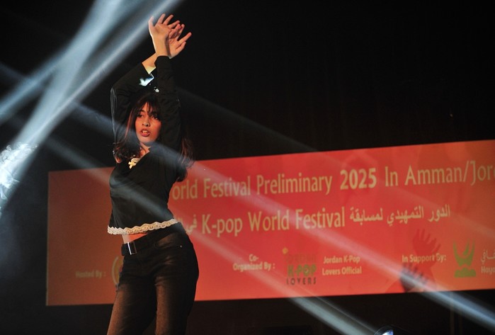 [프레스뉴스] 채정병 특파원=12일(현지시간) 2025 케이팝 월드 페스티벌 요르단 지역예선에 참가한 12개팀(댄스 9팀, 보컬 3팀)이 올해 10월 창원에서 열리는 본선 진출을 위해 저마다의 기량을 뽐낸 가운데 한 참가자가 케이팝에 맞춰 춤을 추고 있다.