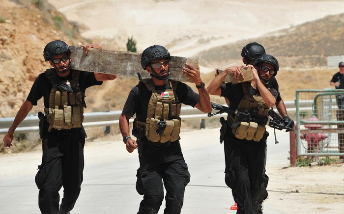[프레스뉴스] 채정병 특파원=9일(현지시간) 25개국 40개 팀이 참가한 제12회 전사대회(Warrior Competition)가 요르단 킹 압둘라 2세 특수작전 훈련센터에서 5일간 열린 가운데 마지막 날 오만 참가팀이 팀워크 종목인 각목 구보를 하고 있다.