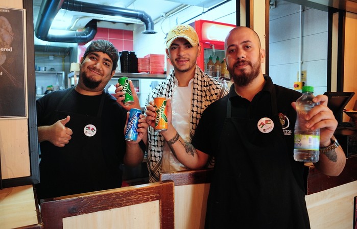 [프레스뉴스] 채정병 특파원=15일(현지시간) 민간인과 하마스를 구별하지 않는 이스라엘의 가자지구 공격으로 희생자들의 수가 눈덩이처럼 커짐에도 불구하고 여전히 이스라엘을 지지하는 미국에 대해 아랍권 국가들의 미국제품 불매운동이 급속히 번진 가운데 요르단의 한 햄버거 매장에서 점원들이 요르단 토종 탄산음료와 물을 들고 포즈를 취하고 있다.