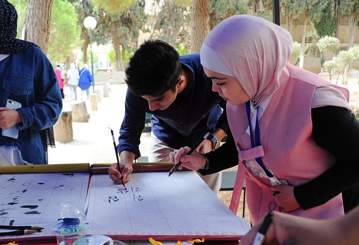 [프레스뉴스] 채정병 특파원=9일(현지시간) 제576돌 한글날을 맞아 암만세종학당이 주최한 한글날 기념행사가 요르단 대학교 교정에서 열린 가운데 학생들이 붓글씨로 한글 써보기 체험을 하고 있다.
