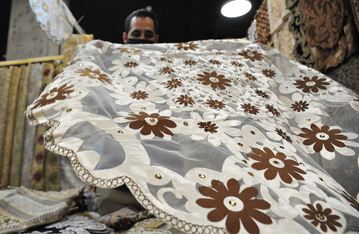 [프레스뉴스] 채정병 특파원=9일(현지시간) 제19회 암만 여름 국제쇼핑페스티벌이 암만의 한 대형 쇼핑몰에서 열린 가운데 한 점원이 수놓아진 시리아 테이블보를 펼쳐 보이고 있다.