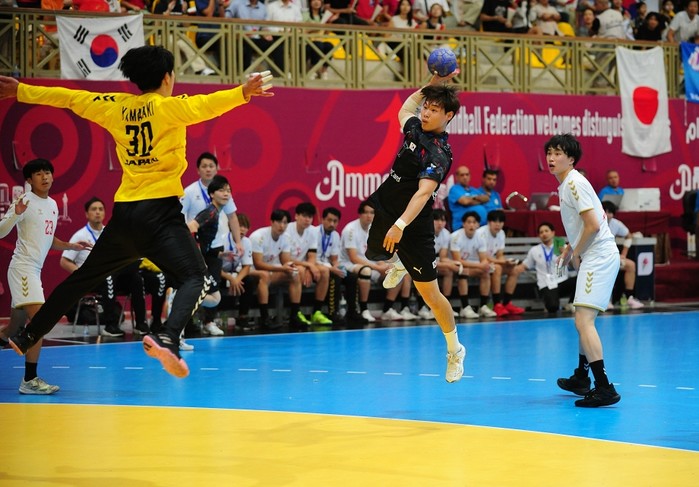 [프레스뉴스] 채정병 특파원=25일(현지시간) 요르단 암만 프린세스 수마이야 경기장에서 열린 제18회 아시아 남자 주니어 핸드볼 선수권대회 한-일 결승전에서 우리 대표팀이 32대27로 아쉽게 패하며 준우승을 거둔 가운데 김현민 선수가 일본 골키퍼와 일대일 상황에서 슛을 시도하고 있다.