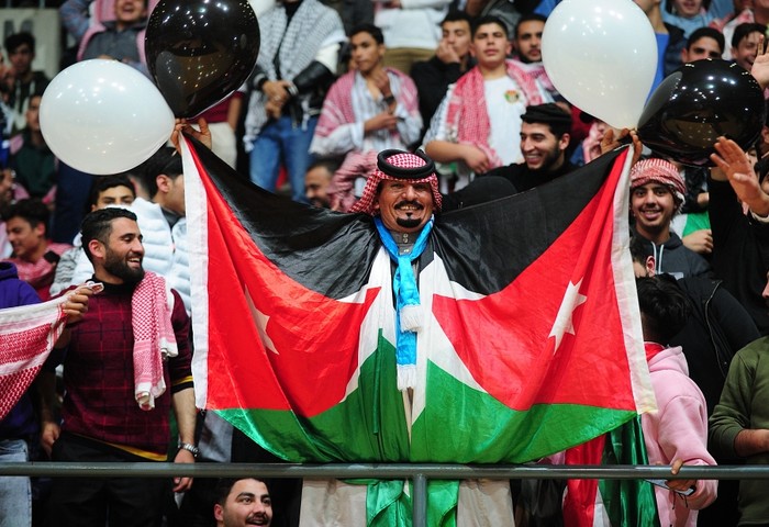 [프레스뉴스] 채정병 특파원=10일(현지시간) 2023년 아시아축구연맹(AFC) 아시안컵 결승전 요르단 대 카타르의 경기에서 요르단을 응원하기 위해 암만 스포츠시티에 모인 시민들 가운데 한 남성이 요르단 국기를 두르고 개성 넘치는 응원을 펼치고 있다.