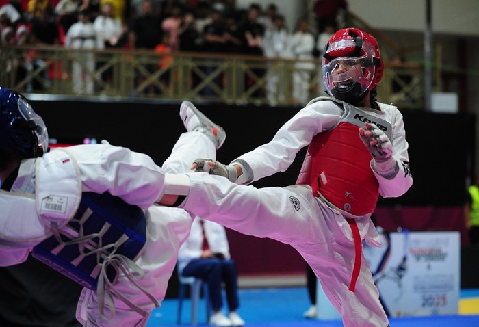 | ▲ 주 요르단 대한민국 대사배 카뎃 여자부 결승전에서 한 선수가 앞발차기를 하고 있다. |