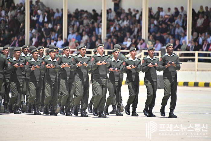 [프레스뉴스] 채정병 특파원=29일(현지시간) 요르단 자르카 국가 군복무 훈련센터에서 열린 제1기 군사훈련수료식에서 수료생들이 연병장에서 총기제식을 하고 있다. 지역 정세불안에 따른 안보강화 등의 목적으로 작년에 법이 통과된 후 올해 2월부터 시작된 의무복무는 요르단 시민권을 가진 전국의 18세 청년들 대상으로 무작위 전자추첨으로 선발되며 3개월간의 기본군사훈련을 받게 된다. (사진=채정병 특파원)