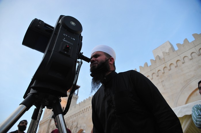 프레스뉴스] 채정병 특파원=1일(현지시간) 올해 라마단 시작일 결정을 위한 초승달 관측이 요르단 킹 후세인 빈 탈랄 모스크에서 열린 가운데 한 이맘(이슬람종교지도자)이 관측장비로 달을 살피고 있다. 초승달이 확인된 사우디아라비아, 카타르, 아랍에미리트 등은 2일(토요일)부터, 요르단은 3일(일요일)부터 한달간의 라마단 금식월이 시작된다.