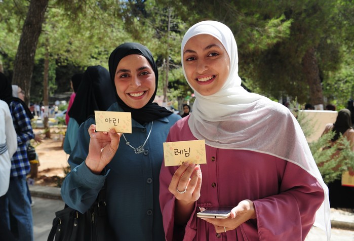 [프레스뉴스] 채정병 특파원=9일(현지시간) 제576돌 한글날을 맞아 암만세종학당이 주최한 한글날 기념행사가 요르단 대학교 교정에서 열린 가운데 학생들이 한글이름 카드를 받고 즐거워하고 있다.