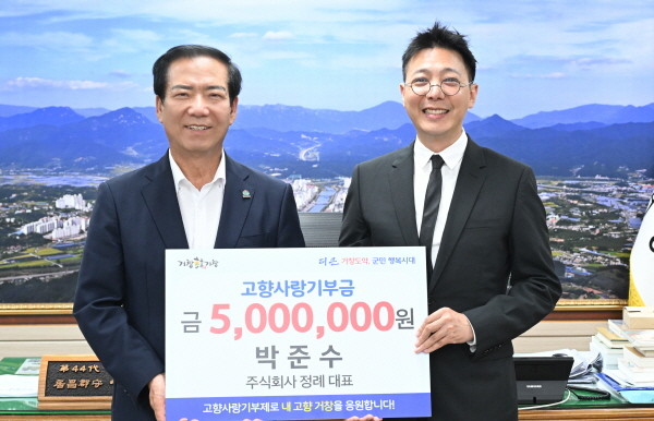 박준수 대표는 거창읍 출신으로 거창대성고를 졸업하고, 현재는 거창군에 소재하고 있는 주식회사 정례를 운영하고 있으며, 고향의 발전과 후배들의 꿈을 응원하는 마음을 담아 고향사랑기부금 500만 원을 기부했다.