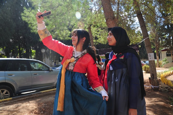 [프레스뉴스] 채정병 특파원=9일(현지시간) 제576돌 한글날을 맞아 암만세종학당이 주최한 한글날 기념행사가 요르단 대학교 교정에서 열린 가운데 학생들이 한복체험코너에서 셀카를 찍고 있다.