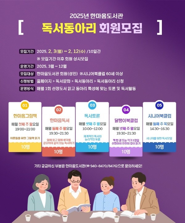 회원 신청은 2월 3일부터 한마음도서관 홈페이지를 통해 도서관 회원(성인)이면 누구나 가능하다.