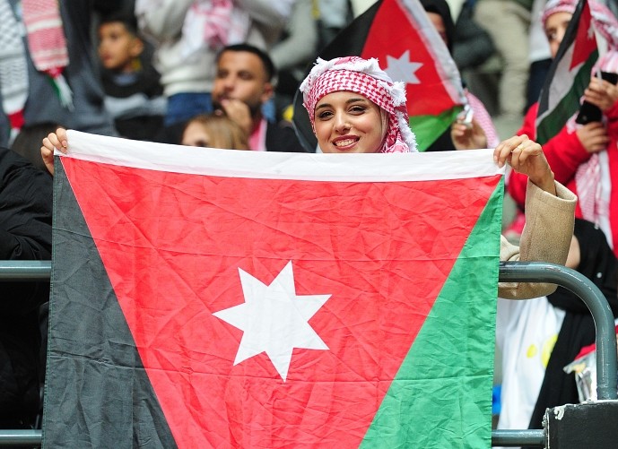 [프레스뉴스] 채정병 특파원=10일(현지시간) 2023년 아시아축구연맹(AFC) 아시안컵 결승전 요르단 대 카타르의 경기에서 요르단을 응원하기 위해 암만 스포츠시티에 모인 시민들 가운데 한 여성이 요르단 국기를 펼치며 응원하고 있다.
