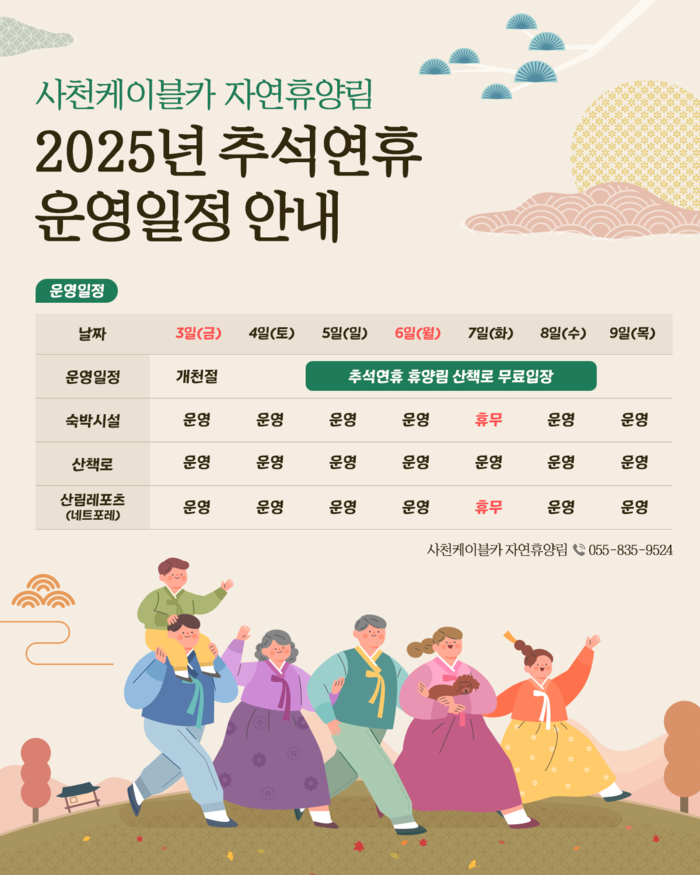▲사천케이블카 자연휴양림 2025년 추석 연휴 운영일정 안내 포스터(사진=사천시) |