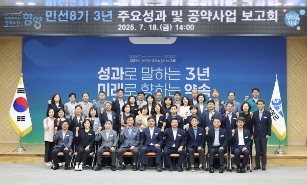 현재 민선 8기 함양군은 총 56개 공약사업 중 44개 공약을 완료했으며, 96%의 공약을 정상적으로 추진하고 있다.