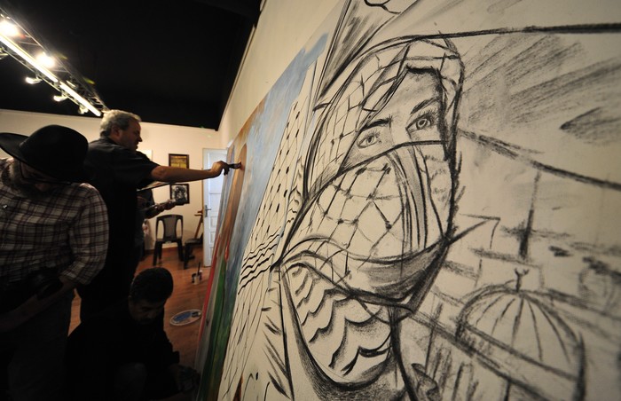 [프레스뉴스] 채정병 특파원=18일(현지시간) 지난 11일 팔레스타인 웨스트뱅크 제닌에서 취재 중 이스라엘군의 총격으로 사망한 쉬린 아부 아클레(여.51) 알자지라 기자를 추모하는 그림 "인간 평화의 소리" 제작이 요르단 조형미술가협회에서 열린 가운데 화가들이 팔레스타인을 상징하는 그림을 그리고 있다.