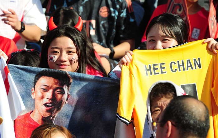 [프레스뉴스] 채정병 특파원=10일(현지시간) 대한민국 축구대표팀이 요르단 암만 국제경기장에서 열린 2026 북중미월드컵 아시아 3차 예선 B조 3차전 요르단과 원정경기에서 2-0으로 승리한 가운데 경기전 황희찬 팬들이 사진과 유니폼을 들고 응원하고 있다.