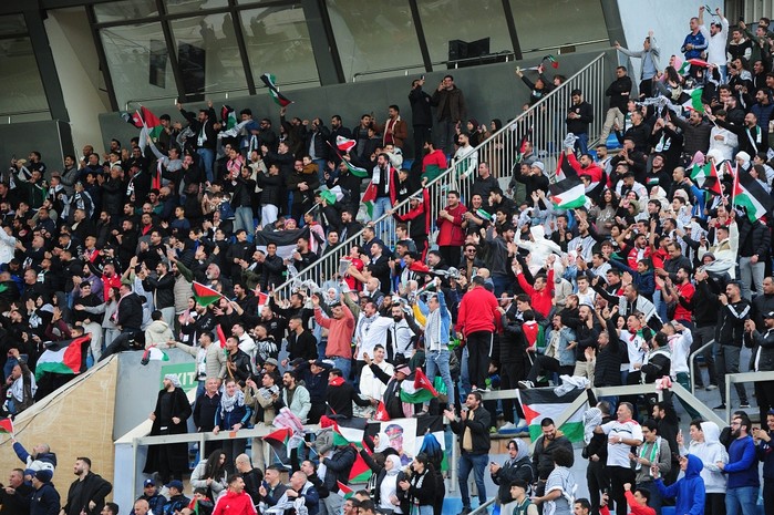[프레스뉴스] 채정병 특파원=19일(현지시간) 요르단 암만 국제 경기장에서 열린 2026 북중미 월드컵 아시아 3차 예선 B조 6차전 대한민국 대 팔레스타인의 경기가 1-1 무승부로 끝난 가운데 전반 12분, 팔레스타인의 선제골이 터지자 팔레스타인 관중들이 열광하고 있다.