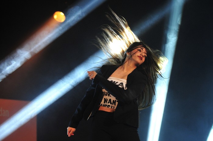 [프레스뉴스] 채정병 특파원=12일(현지시간) 2025 케이팝 월드 페스티벌 요르단 지역예선에 참가한 12개팀(댄스 9팀, 보컬 3팀)이 올해 10월 창원에서 열리는 본선 진출을 위해 저마다의 기량을 뽐낸 가운데 한 참가자가 케이팝에 맞춰 춤을 추고 있다.