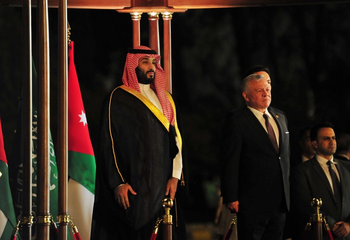 [프레스뉴스] 채정병 특파원=21일(현지시간) 무함마드 빈 살만(왼쪽) 사우디아라비아 왕세자가 이집트 방문을 마치고 두번째 순방국인 요르단의 퀸 알리아 국제공항에 도착해 영접나온 압둘라 2세 요르단 국왕과 공식환영식을 하고 있다.