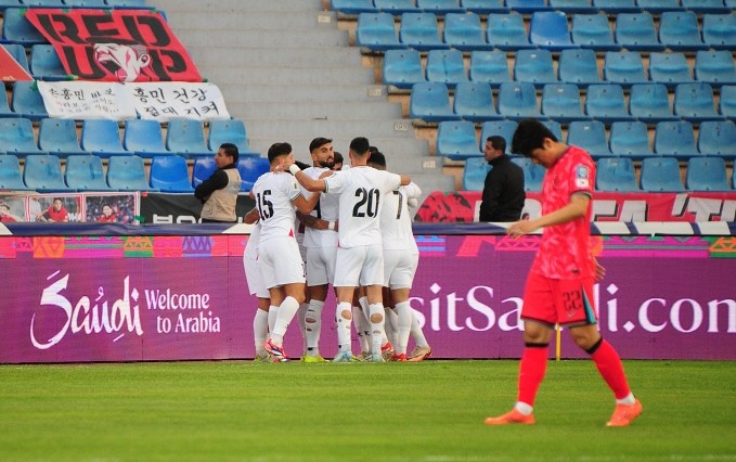 [프레스뉴스] 채정병 특파원=19일(현지시간) 요르단 암만 국제 경기장에서 열린 2026 북중미 월드컵 아시아 3차 예선 B조 6차전 대한민국 대 팔레스타인의 경기가 1-1 무승부로 끝난 가운데 전반 12분 팔레스타인 자이드 쿤바르가 선제골을 터트리자 선수들이 기뻐하고 있다.