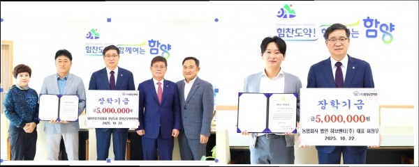 (재)함양군장학회는 지난 22일 대한전문건설협회 경남도회 함양군위원회(위원장 강인익)와 농업회사 법인 허브앤티(주) 허정우 대표가 각각 500만 원의 장학금을 기탁했다고 밝혔다.