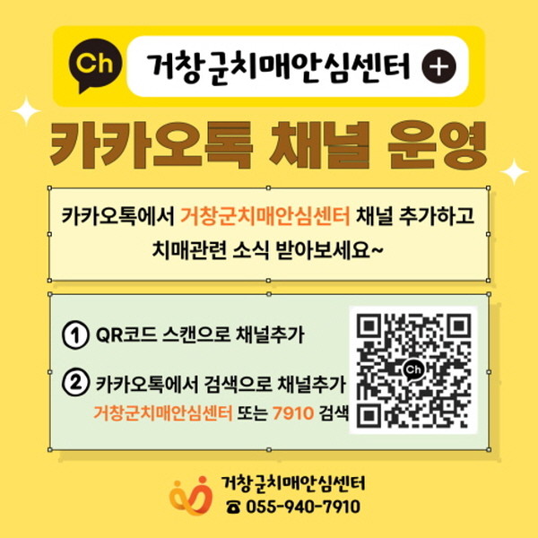 채널 이용방법은 카카오톡 앱에서 ‘거창군치매안심센터’ 또는 대표번호 ‘7910’을 검색하거나 포스터의 QR코드를 스캔해서 추가하면 된다.
