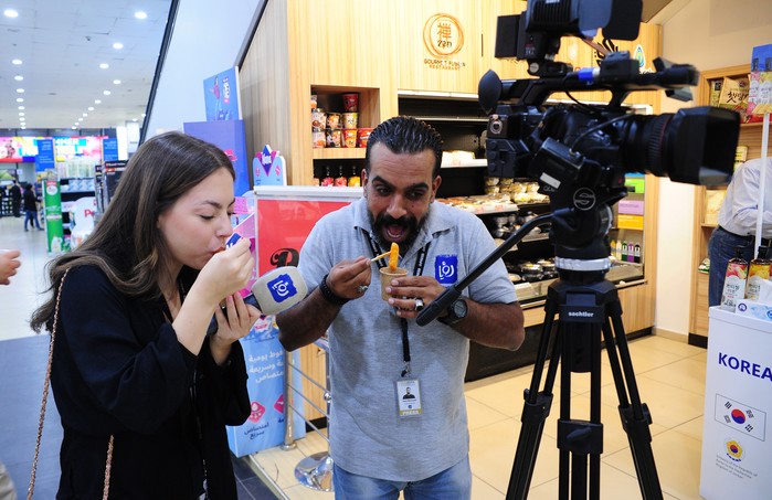 [프레스뉴스] 채정병 특파원=22일(현지시간) 요르단 암만의 한 대형마트에서 열린 K-Food Week 행사를 취재하러 온 요르단 현지 방송국 리포터와 카메라맨이 취재 중 떡볶이를 시식하고 있다.