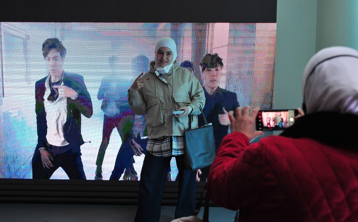 [프레스뉴스] 채정병 특파원=24일(현지시간) 한류문화행사 'Feel Korea 2021'이 요르단 암만 라스 알 아인 갤러리에서 열린 가운데 한 여성이 케이팝 아이돌 그룹 비디오 앞에서 사진을 찍고 있다.