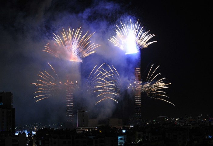[프레스뉴스] 채정병 특파원=25일(현지시간) 요르단 독립 79주년을 축하하는 불꽃놀이가 암만의 랜드마크인 조던 게이트 타워스(Jordan Gate Towers) 빌딩 사이에서 펼쳐지고 있다.