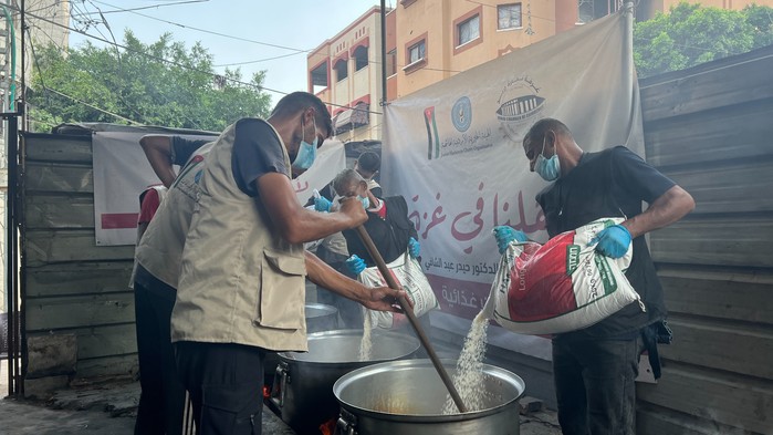 [프레스뉴스] 채정병 특파원=요르단의 대표적인 인도주의 구호단체인 하쉬미야 자선기구(JHCO)는 가자전쟁 발발 이후 지금까지 가자지구 내에서 타카야(무료급식) 프로젝트를 통해 주민들에게 1,043,920인분의 식사를 제공해 오고 있는 가운데 직원들이 주민들에게 나누어 줄 음식을 만들고 있다.