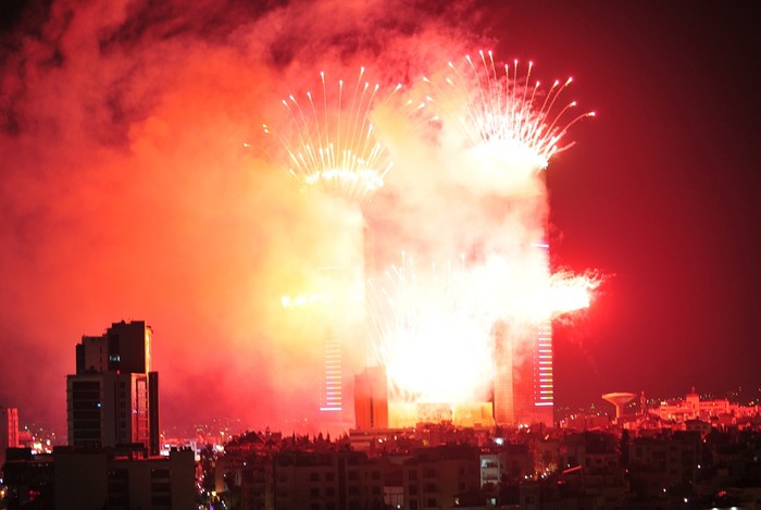 [프레스뉴스] 채정병 특파원=25일(현지시간) 요르단 독립 79주년을 축하하는 불꽃놀이가 수도 암만의 밤하늘을 붉게 물들이고 있다.