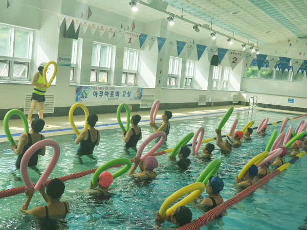 아쿠아로빅은 수중에서 하는 건강체조로, 근골격계 및 만성·퇴행성 질환자의 신체적 부담을 줄이고 통증 완화에 도움을 주어 스트레스와 우울증 예방에도 도움을 준다.