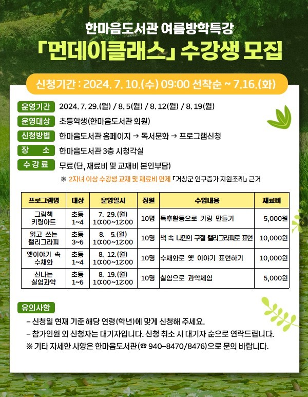 | ▲ 거창군 한마음도서관 여름방학 특강 먼데이클래스 수강생 모집(사진=거창군) |