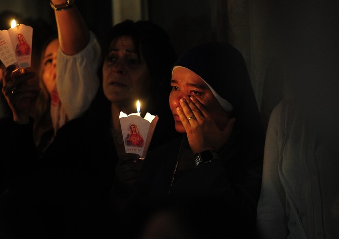 [프레스뉴스] 채정병 특파원=21일(현지시간) 요르단 암만의 탈라 알 알리 가톨릭 교회에서 팔레스타인의 평화와 가자지구 희생자들을 애도하는 촛불미사가 열린 가운데 한 수녀가 눈물을 닦고 있다.