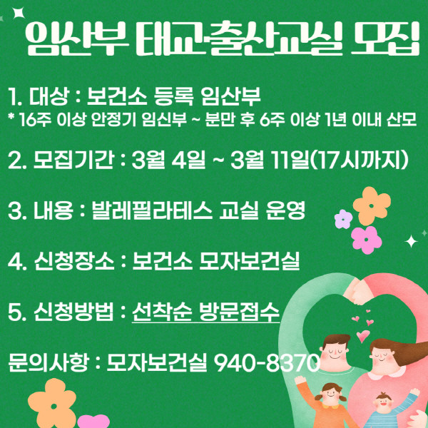 이번 태교·출산 교실은 임신 중 건강관리와 출산부의 산후조리를 위한 사업으로, 보건소 등록 임산부 중 16주 이상 안정기 임신부부터 출산 후 1년 이내 임산부 20명을 대상으로 진행한다.