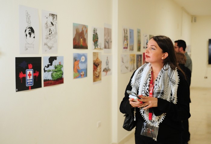[프레스뉴스] 채정병 특파원=2일(현지시간) 가자지구에서 자행되고 있는 비인도주의의 실상과 참혹함을 알리는 국제 카툰 전시회가 요르단 암만에서 진행 중인 가운데 팔레스타인 두건을 목에 두른 한 여성이 작품들을 감상하고 있다.