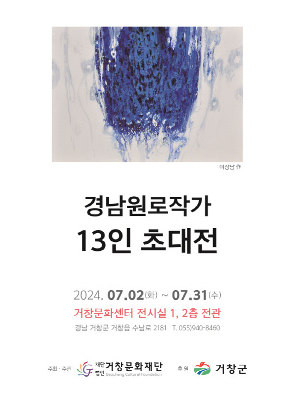 ‘경남원로작가 13인 초대전’과 관련된 궁금한 사항은 거창문화재단 홈페이지(gccf.or.kr)를 참고하거나 전화(055-940-8453)로 문의하면 된다.
