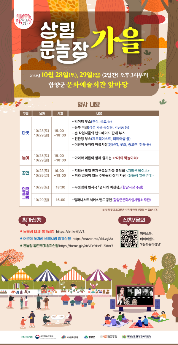 이번 10월 상림 문화놀이장날은 28~29일 오후 3시부터 6시까지는 먹거리, 농부 마켓, 손 작업자의 핸드 메이드 제품 판매, 제로웨이스트 등 친환경 부스와 어린이 돗자리 벼룩시장, 그리고 아이와 어른이 함께 즐길 수 있는 N개의 막놀이터가 운영된다.