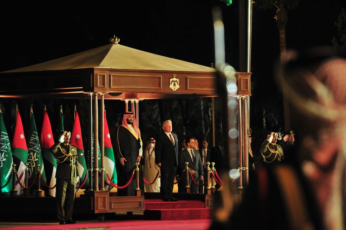 [프레스뉴스] 채정병 특파원=21일(현지시간) 무함마드 빈 살만 사우디아라비아 왕세자가 이집트 방문을 마치고 두번째 순방국인 요르단의 퀸 알리아 국제공항에 도착해 영접나온 압둘라 2세 요르단 국왕과 공식환영식을 하고 있다.