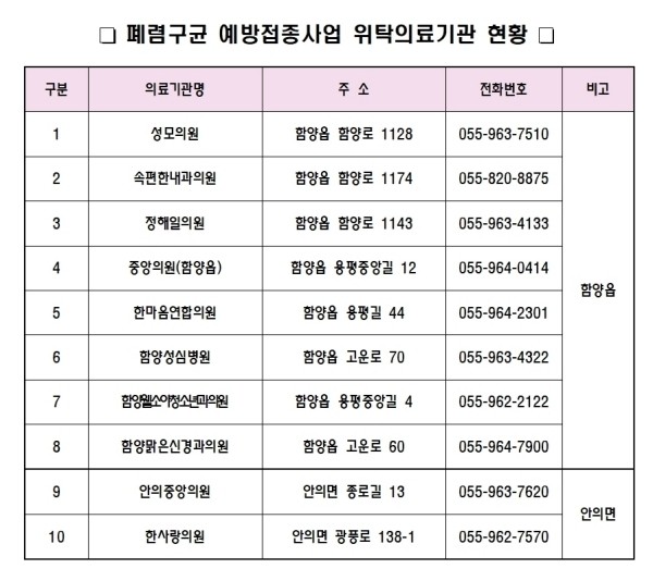 | ▲ 폐렴구균 예방접종사업 위탁의료기관 현황(사진=함양군) |