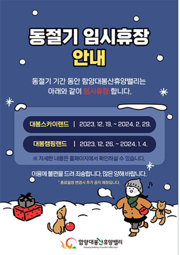 대봉스카이랜드는 오는 19일부터 내년 2월 29일까지, 숙박과 야영을 즐길 수 있는 대봉캠핑랜드는 26일부터 내년 1월 4일까지 각각 휴장하기로 결정했다.
