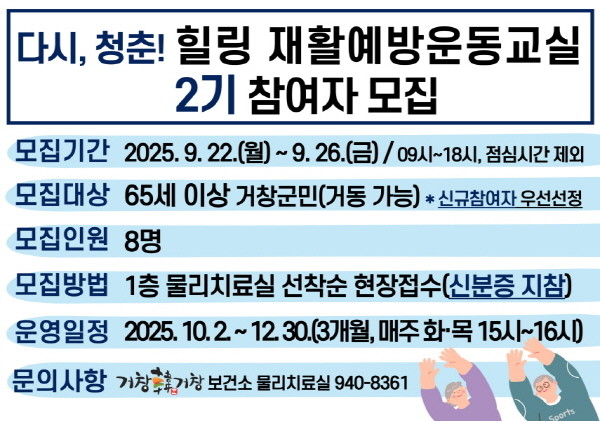 자세한 사항은 거창군보건소 물리치료실(☎ 055-940-8361)로 문의하면 된다.