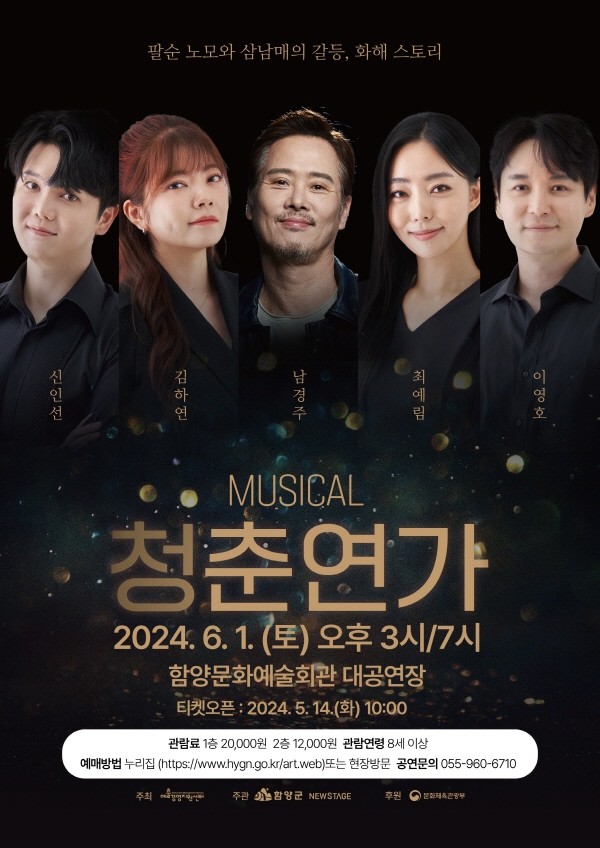 티켓 예매는 오는 14일 10시부터 온라인(인터파크 및 함양문화예술회관 홈페이지, 5월 31일까지) 및 현장결제(문화예술회관 1층, 6월 1일 공연전까지)가 가능하며, 관람료는 1층 20,000원, 2층 12,000원이며 8세 이상 관람할 수 있다.
