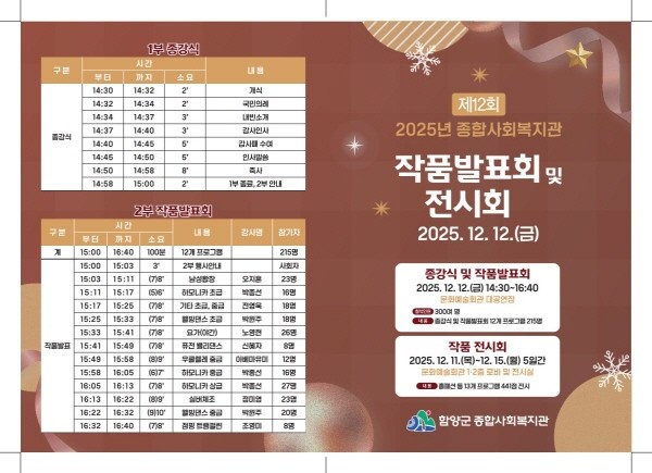 또한 문화예술회관 1‧2층 로비와 2층 전시실에서는 원예 인테리어, 천아트, 홈패션, 어반스케치, 매듭·구슬공예 등 13개 프로그램의 작품 440여 점이 12월 11일부터 15일까지 5일간 전시된다.