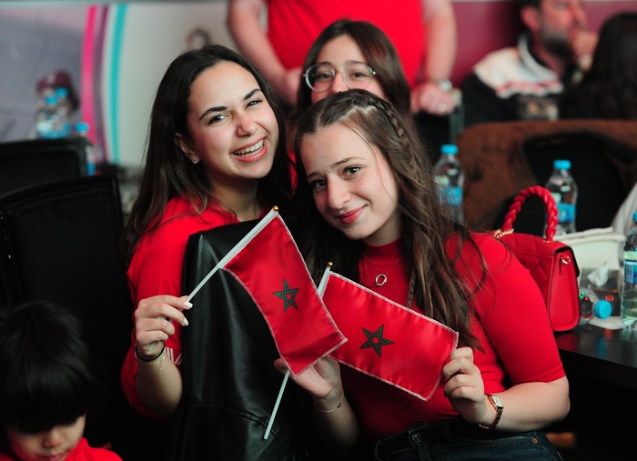 [프레스뉴스] 채정병 특파원=10일(현지시간) 2022 카타르 월드컵 모로코 대 포르투갈의 8강전이 펼쳐진 가운데 요르단 암만에서 스크린 응원을 펼치는 요르단 소녀들이 모로코 국기를 들고 포즈를 취하고 있다.